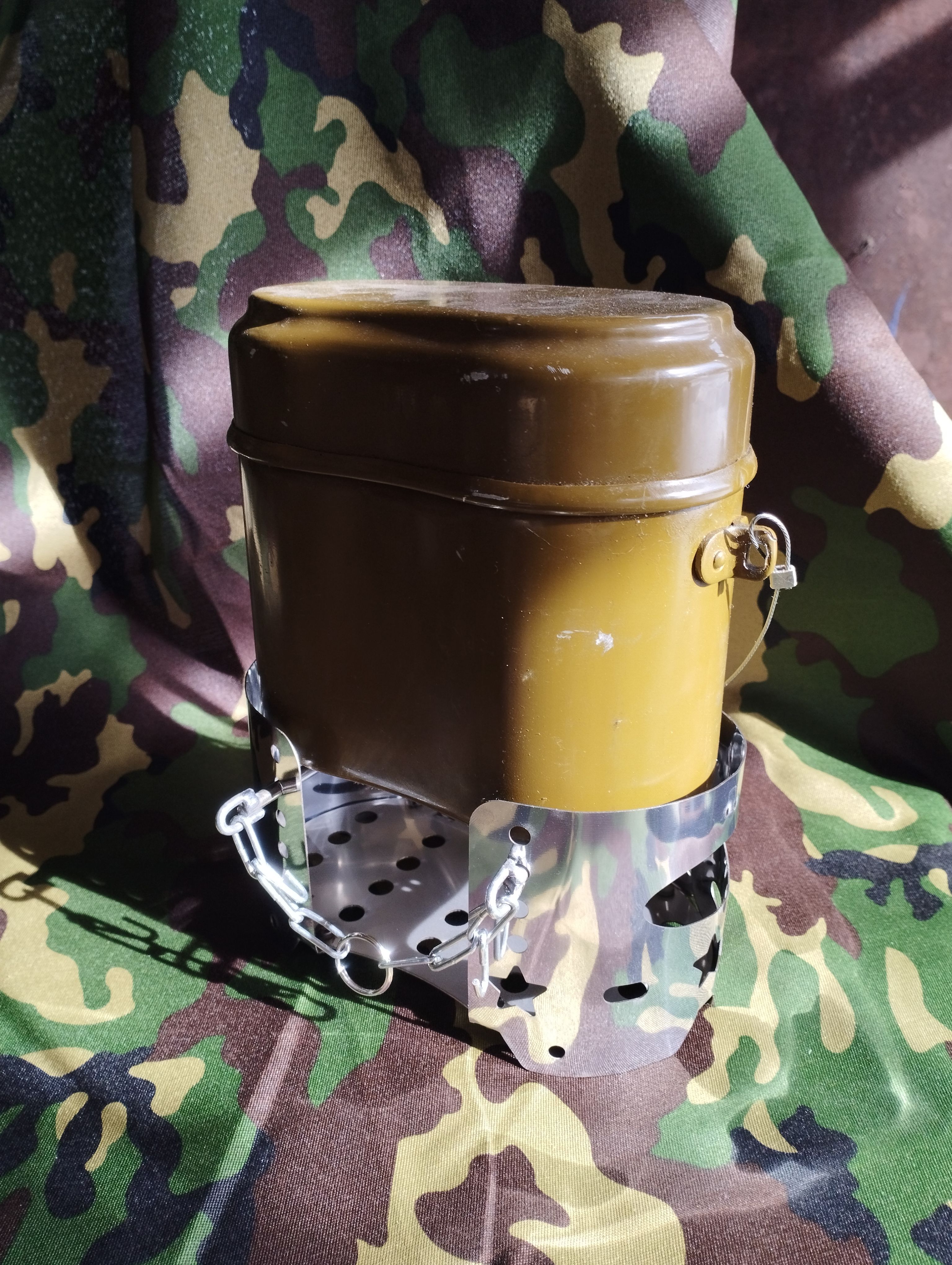 Итак, что же представляет собой эта ультра-грелка степных водителей? Это обычный армейский котелок. В его дне по кругу просверлены крупные отверстия. В крышке в произвольном порядке сделаны мелкие дырочки, а по краю их ещё больше — видимо, владелец не сдерживал фантазию.