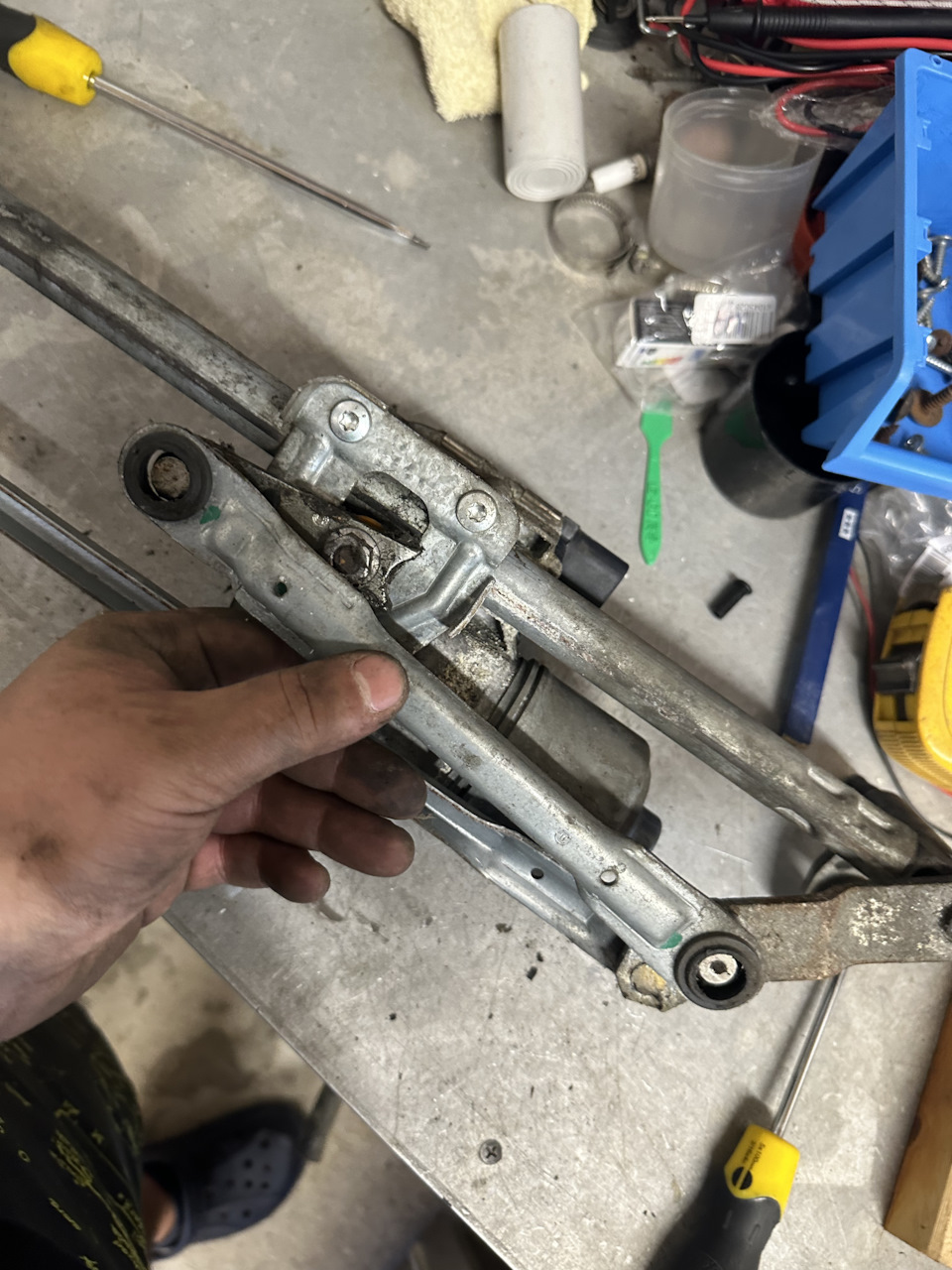 Логичным следующим шагом стал визуальный поиск повреждения жгута проводов, идущего к дворникам. Для этого потребовалось снять аккумуляторную батарею, чтобы получить доступ.
