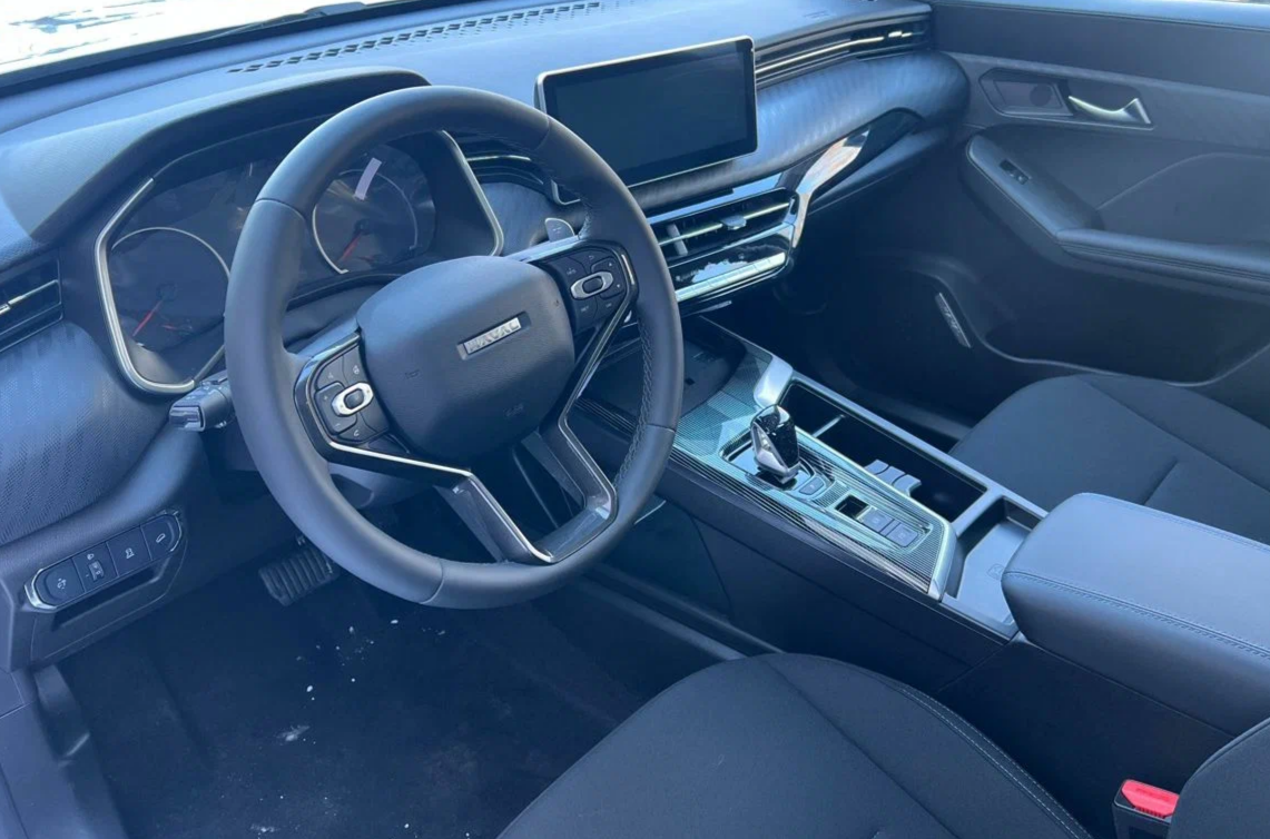 Салон Haval Jolion в данной комплектации отделан тканью. Водительское место предлагает механическую регулировку сидений, мультифункциональный кожаный руль и классическую приборную панель с аналоговыми шкалами. Важным преимуществом является наличие физических кнопок для управления основными функциями климата и мультимедиа, что повышает безопасность и удобство в дороге. Мультимедийная система имеет экран диагональю 10 дюймов.