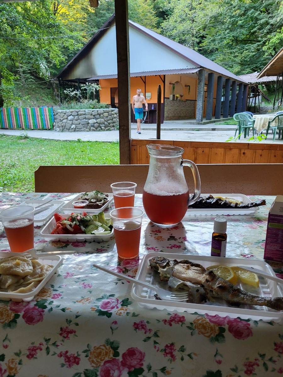 Ещё более сильные эмоции мы получили, поднявшись выше в горы вдоль реки Шахе, в район Большого Кичмая. Виды на бурную горную реку и окружающие хребты просто завораживают. Там же, в горах, находится кафе «Саусрыко», где можно собственноручно выбрать форель, которую тут же для вас приготовят на углях. Это был один из гастрономических пиков нашей поездки. Отмечу, что с выбором качественных мест для питания в Лоо в целом есть сложности, поэтому такие находки особенно ценны. Ещё одним приятным открытием стал ресторан «Старая мельница».