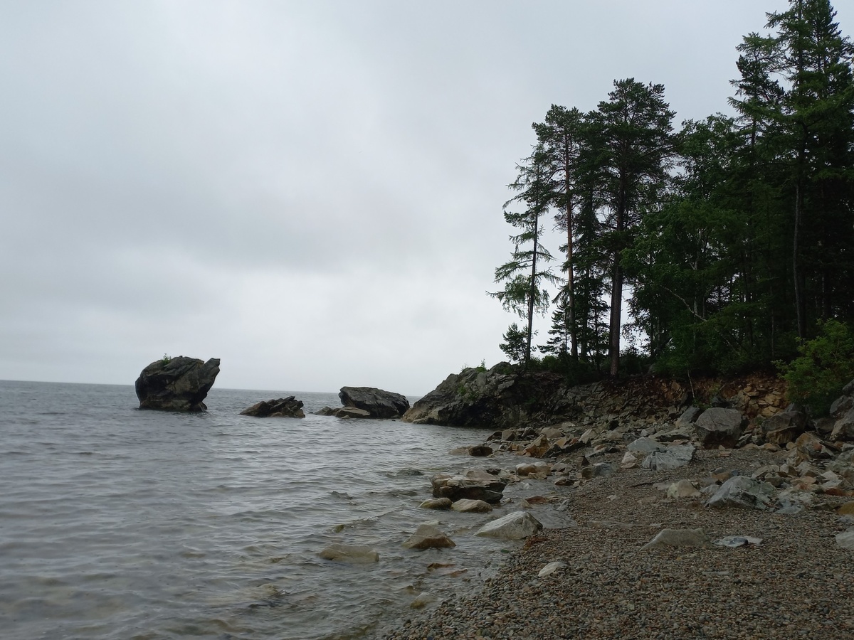 Первая остановка — у скалы Черепаха (координаты: N 52° 58.180' E 108° 14.681'). Небольшой камень стоял в воде, мокнув под дождём. Народу не было, хотя место популярное.