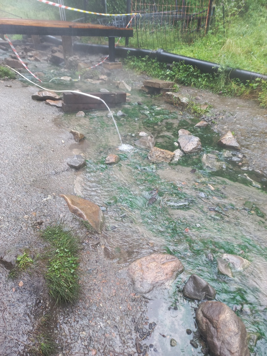 Мы прогулялись мимо старых корпусов, прошлись по аллеям парка и нашли источник. Вода оказалась очень горячей, более пятидесяти градусов, но если отойти чуть дальше, то температура становилась комфортной. Мы постояли, попарили ноги — настоящее блаженство.